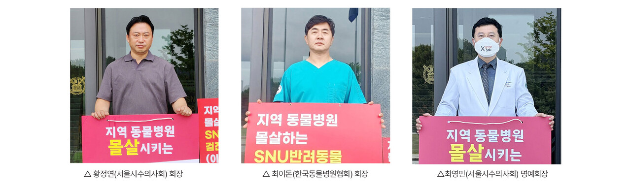 이들은 “‘SNU반려동물검진센터’는 수의계를 기만하는 불공정 영업행위”라고 규정하면서 “즉각 운영을 중단하고 철회하라”고 촉구했다. 광진구수의사회도 6월 23일부터 계속해서 ‘SNU반려동물검진센터’ 앞에서 1인 시위를 벌이고 있어 사업의 철폐를 촉구하는 수의사들의 목소리는 계속 이어질 전망이다.
