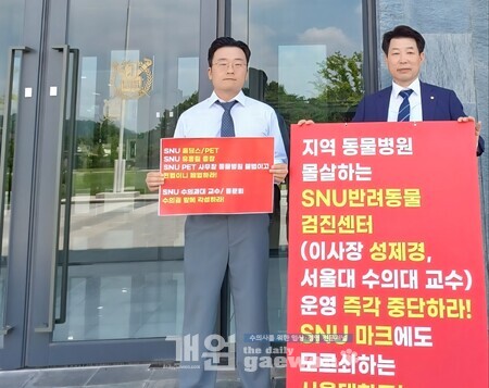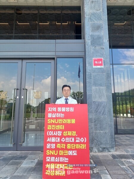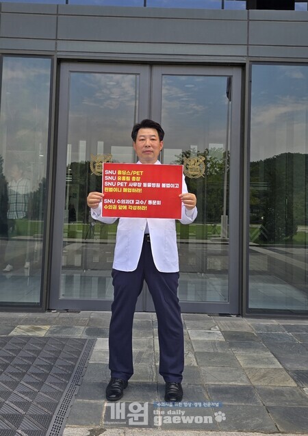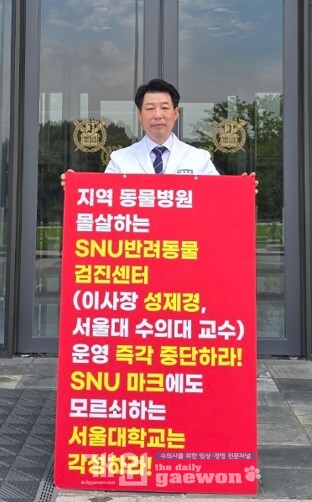SNU반려동물검진센터(이사장 성제경) 철폐를 촉구하는 수의계의 1인 릴레이 시위가 서울대학교 관악캠퍼스 행정관 앞에서 계속되고 있는 가운데, 이영락(부산시수의사회) 회장은 지난 7월 24일(목) 1인 시위 진행 도중 서울대 유홍림 총장을 만나 SNU반려동물검진센터의 부당성을 설명하고, 폐업할 것을 강력히 요청했다.