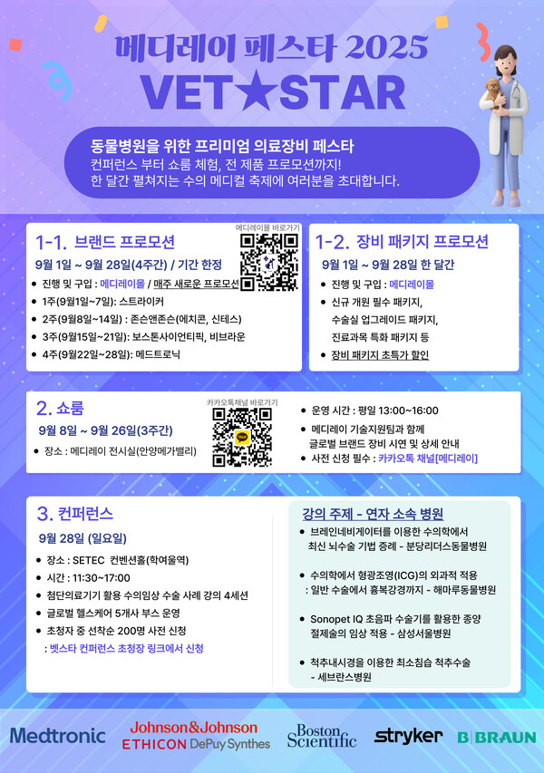 메디레이(대표 이승준)가 동물병원 진료·수술 장비의 최신 트렌드를 한 자리에서 만나볼 수 있는 메디레이 페스타 ‘2025 VETSTAR’를 9월 한 달간 개최한다.