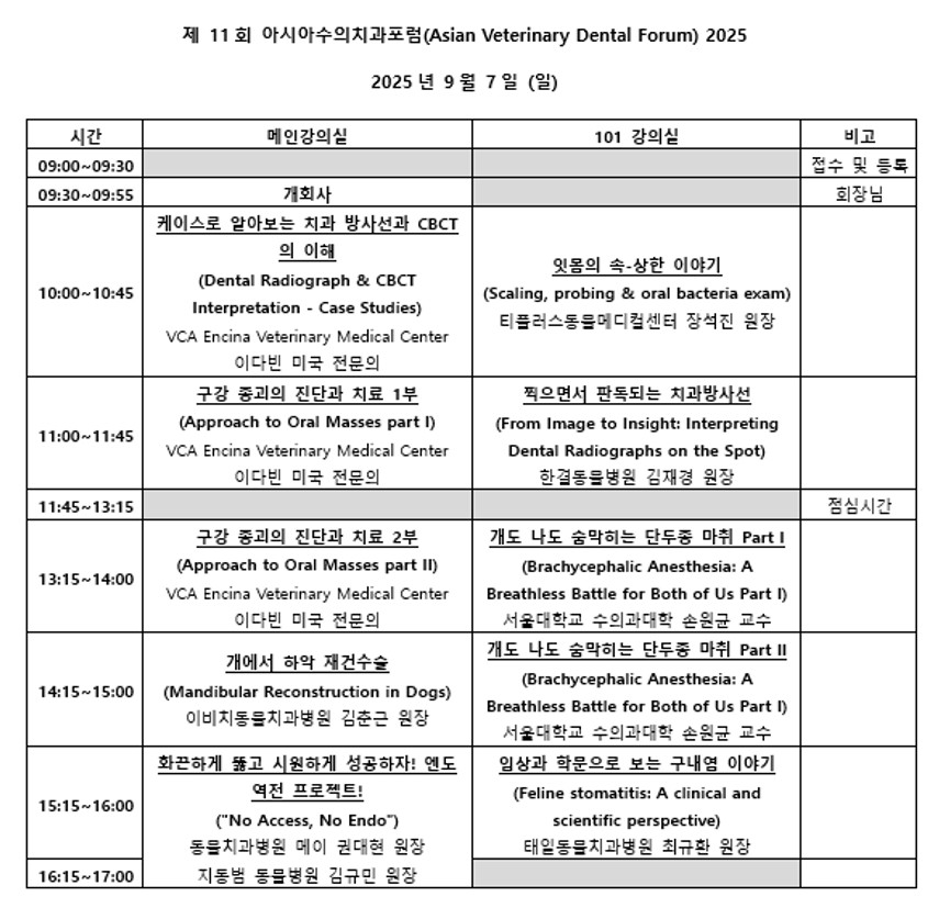 이번 포럼은 실전 중심의 수의치과 지식을 공유하는 자리로 치과 영상, 종양, 하악 재건, 마취, 치주 질환 등 다양한 주제를 다룰 예정이다.