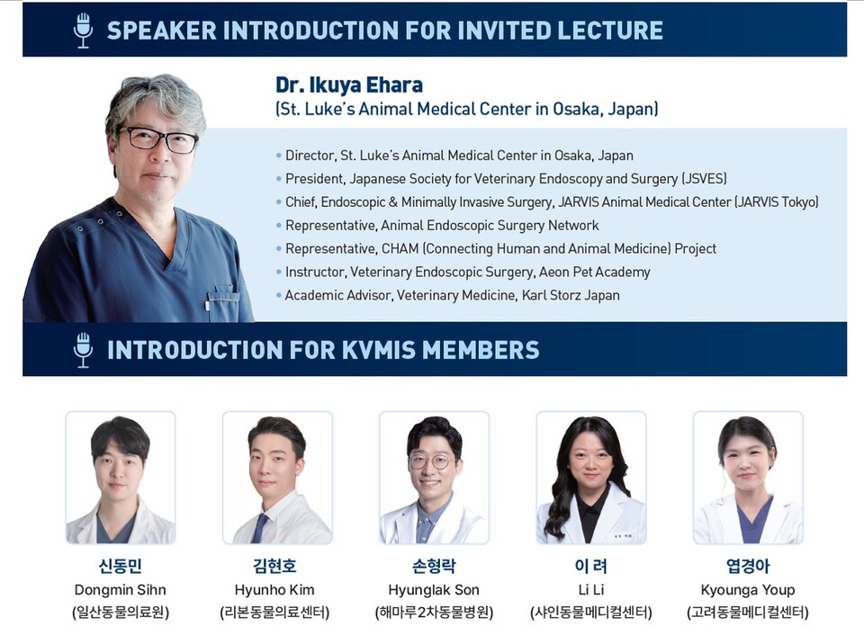 이번 코스는 작년에 이어 KVMIS가 개최하는 두 번째 핸즈온 워크숍으로 일본 오사카에 위치한 St. Lukes’s Animal Medical Center의 Ikuya Ehara 수의사를 특별히 초청해서 진행된다.