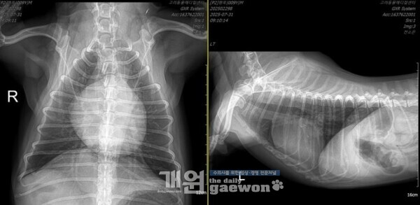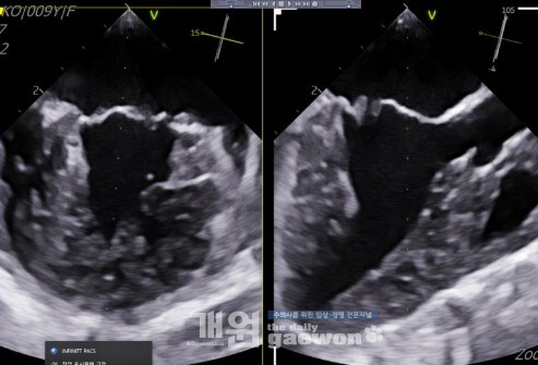 여기까지만 봤을 때는 피모벤단만 처방이 나가는 것, 리즈너블 하다고 생각할 수 있다. 그런데 같은 환자의 경식도 초음파 영상을 보자.