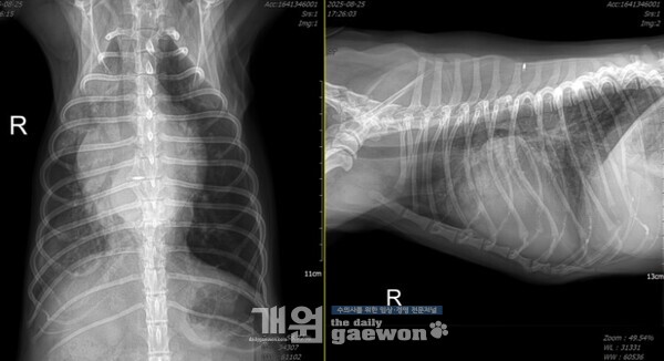 또 다른 환자의 흉부방사선이다.