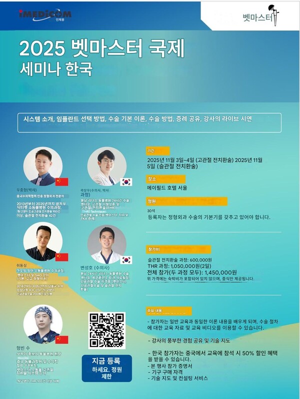 벳마스터가 주최하는 ‘2025 벳마스터 국제 세미나’가 오는 11월 3일(월)부터 5일(수)까지 사흘간 메이필드 호텔 서울에서 열린다. 이번 세미나는 고관절 전치환술(THR)과 슬관절 전치환술(TKR)과 관련해 임플란트 선택 방법, 수술 기본 이론과 수술 기법, 다양한 증례 공유, 강사의 라이브 시연까지 포함된 실전형 프로그램으로 마련됐다.