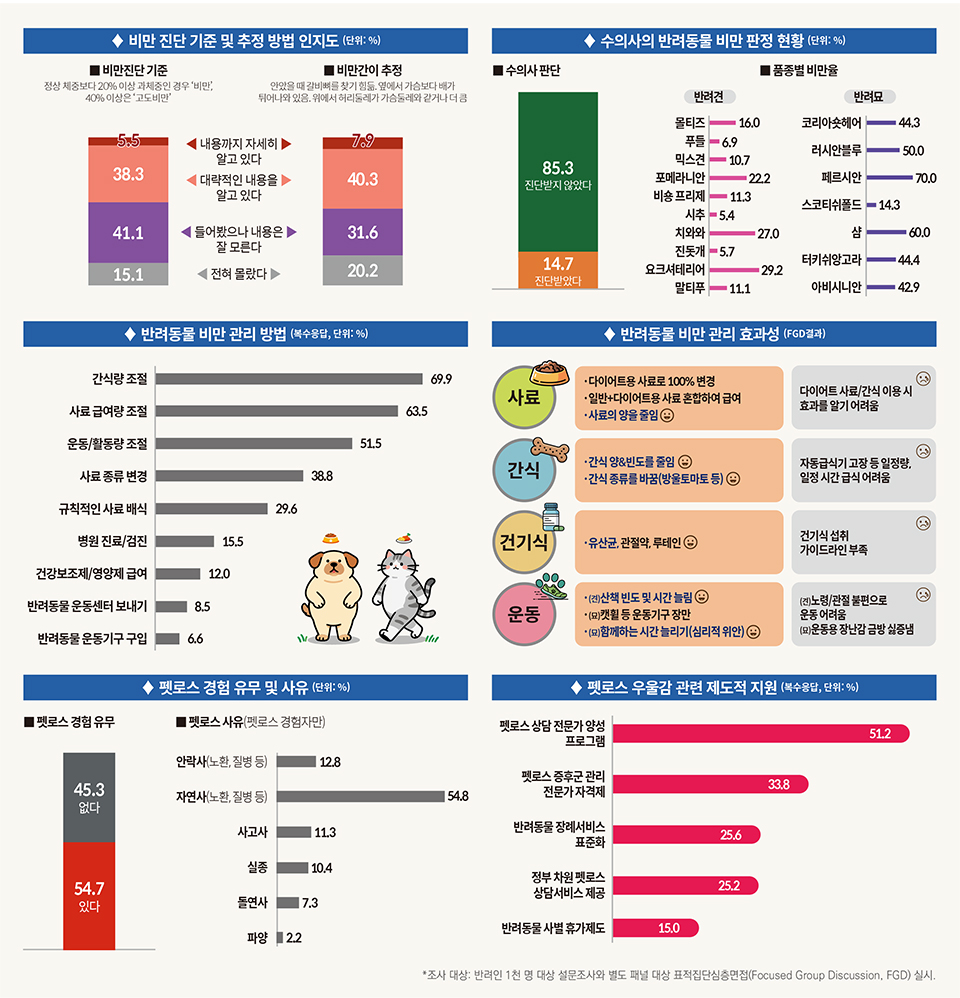 체중을 활용한 비만 진단 기준이나 ‘눈바디’ 비만 추정 방법에 대해서도 45% 정도만 인지하고 있었다. 수의사의 비만 판정을 받은 반려동물은 14.7%로 나타났는데, 한국인이 선호하는 반려견과 반려묘의 각각 상위 10개 품종에 대해 비만율을 보면, 반려견은 ‘요크셔테리어’(29.2%), ‘치와와’(27.0%), ‘포메라니안’(22.2%) 순으로 20% 이상 높은 비만율을 보였고, 반려묘는 ‘스코티시폴드’(14.3%)를 제외한 나머지 6종이 40% 이상의 높은 비만율을 나타냈다.