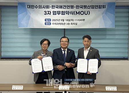대한수의사회(회장 허주형)가 지난 9월 18일 성남 수의과학회관에서 한국애견연맹(총장 전월남), 한국펫산업연합회(회장 이기재)와 동물복지 육성 체계 확립 및 전문 브리더 양성을 위한 업무 협약을 체결했다.