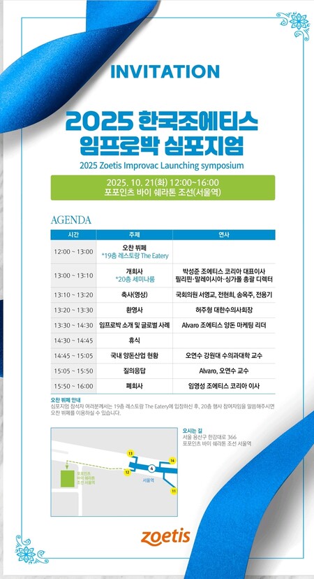 한국조에티스(대표 박성준)가 ‘임프로박(Improvac)’ 국내 출시를 기념해 ‘2025 한국조에티스 임프로박 심포지엄’을 10월 21일(화) 12시부터 4시까지 서울 포포인츠 바이 쉐라톤 조선에서 개최한다.