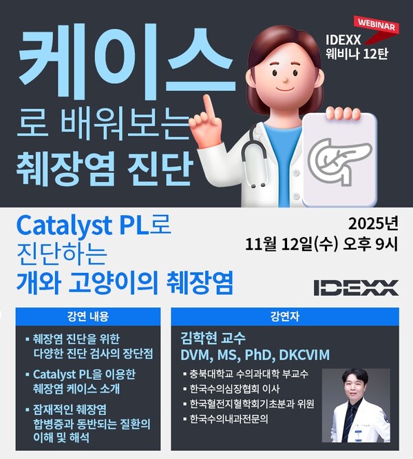 IDEXX 관계자는 “이번 웨비나를 통해 수의사들이 Catalyst PL 검사를 활용해 환자의 상태를 보다 정확하게 검사하고, 췌장염을 조기 진단하여 최적의 치료 결정을 내릴 수 있도록 지원하고자 한다”고 밝혔다.