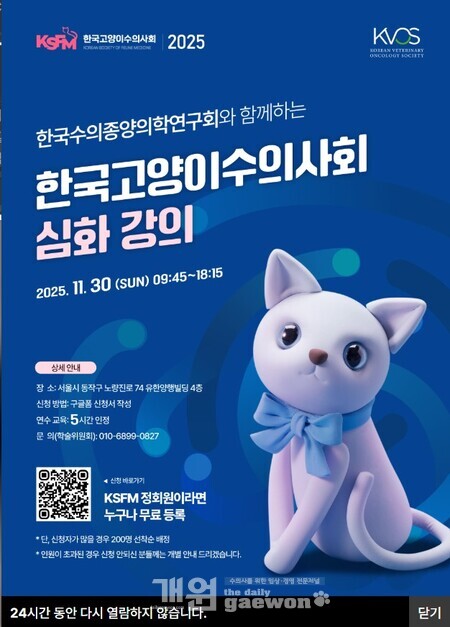 이어 황태성(경상대 부속동물병원) 원장이 ‘고양이 전종격동 종양에서의 방사선치료 적용’을, 윤학영(전북대) 교수가 ‘고양이 종괴성 병변에서 영상진단의 활용’에 대해 강의한다.