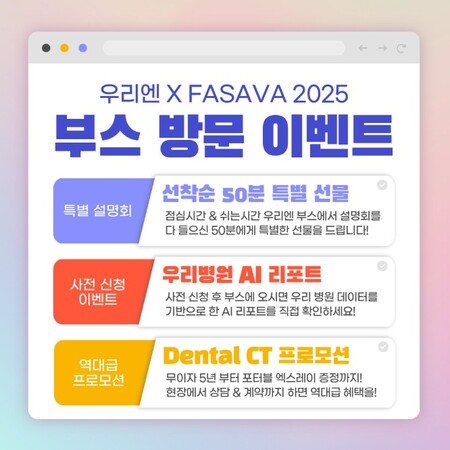 우리엔 관계자는 “이번 ‘FASAVA 2025’에서 “듣고, 생각하고, 정리하는 차트”라는 슬로건으로 우리엔 AI를 선보인다”며 “진료실로 들어온 AI가 만들어 내는 ‘자동화’의 마술을 직접 체험해 보실 수 있도록 체험 신청을 받는다”고 밝혔다.