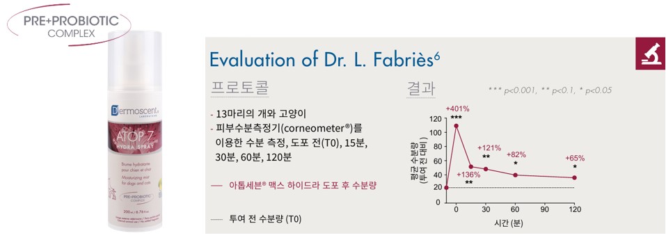 ‘아톱 7 맥스 하이드라’의 미스트를 털이 자라는 역방향으로 분사한 후 닦아낼 필요가 없고, 끈적임이나 번들거림 없이 산뜻한 제형과 은은한 향을 반려동물과 보호자에게 선사한다. 건성 또는 알러지/아토피 피부에 사용해 수분 공급 및 피부장벽을 도울 수 있을 뿐만 아니라 약용샴푸나 스테로이드를 반복적으로 사용하면 피부가 건조해질 수 있어 이때 또한 사용하면 효과적이다. 피부장벽을 강화하는 데 필요한 필수지방산(오메가3, 6)이 풍부한 식물성 오일은 물론이고, 수분 공급을 위해 나토검(Natto gun)과 식물성 글리세린을 함유했으며, 피부 보호를 위한 붉은 미세조류 추출물을 사용했다.