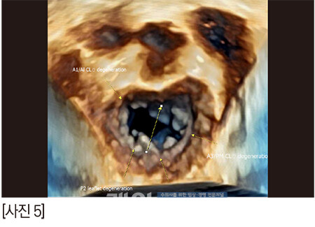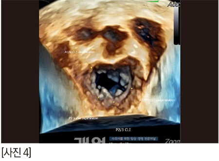 anterior의 zone 2-3과 posterior의 zone 2가 좀 뒤집어지고 있다. 이것은 건삭의 일부가 끊어져 너덜거리는 것으로 예측한다. 2D에서는 역류가 심해 보이지 않았지만 3D에서는 꽤 심해 보인다.
