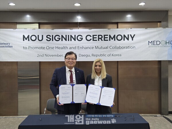 대한수의사회(회장 허주형, 이하 대수회)가 지난 11월 2일 ‘FASAVA 2025’가 진행된 대구 EXCO에서 그리스의 지중해원헬스혁신센터(회장 Eleni Pavlidou, Mediterranean One Health Innovation Centre, 이하 MED-OHC)와 원헬스 증진을 위한 교육, 정보 교유 등 국제 협력 강화를 위한 업무협약을 체결했다.