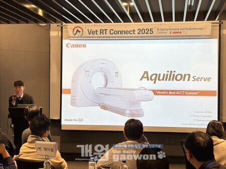 이어 캐논코리아메디칼시스템즈의 정순민 선임은 캐논의 수의 시뮬레이션 CT 장비인 ‘Aquilion Serve’를 소개하고, AI 기반 영상 재구성 기술과 정밀한 시뮬레이션 역량이 수의 방사선치료 계획 수립에 제공하는 임상적 가치를 강조했다.