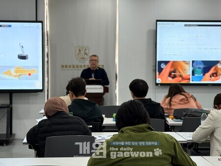 이번 과정은 ‘고급 수의안과 실습과정-백내장, 수정체 수술’ 코스로 백내장·수정체·망막 수술 핵심 마스터 과정이다. ECVO(유럽수의안과학회) 전문의의 이론 강의와 실습으로 초음파 유화, IOL 삽입, 망막박리 치료까지 안내내·후안부 수술의 핵심 기술을 배울 수 있었던 기회로 참가자 2명당 1대의 초음파 유화기를 사용해 소규모 집중 실습으로 맞춤형 지도를 받으며, 모든 수술 단계의 합병증 대응까지 다뤘다.