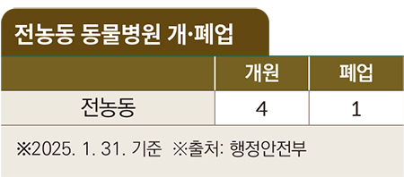 행정안전부 최신 데이터에 따르면, 동대문구 전농동은 2004년부터 동물병원이 개원하기 시작해 2025년 1월 31일 기준 총 5개소가 개원, 이 중 1개소(20%)가 문을 닫고, 현재 4개소(80%)가 개원을 유지하고 있다.