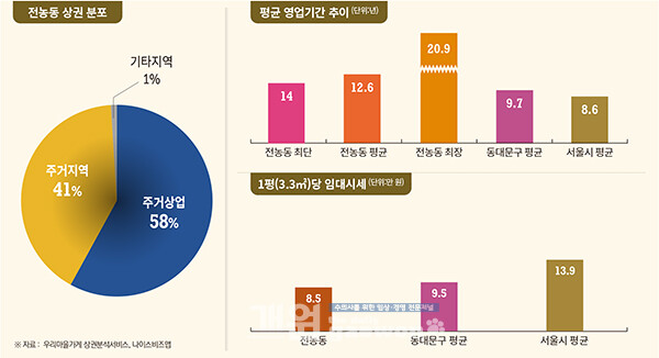 전농동은 청량리역 생활권에 포함된 주거 중심 상권으로, 청량리역과 전농사거리를 중심으로 대규모 아파트 단지와 기존 저층 주거지가 혼재돼 있다. 청량리역 복합환승센터와 대형 상업시설의 영향권에 속해 평일 낮 시간대 유동이 일정 수준 유지되지만 대로변을 벗어난 주거지 내부에서는 생활형 수요가 중심을 이룬다.