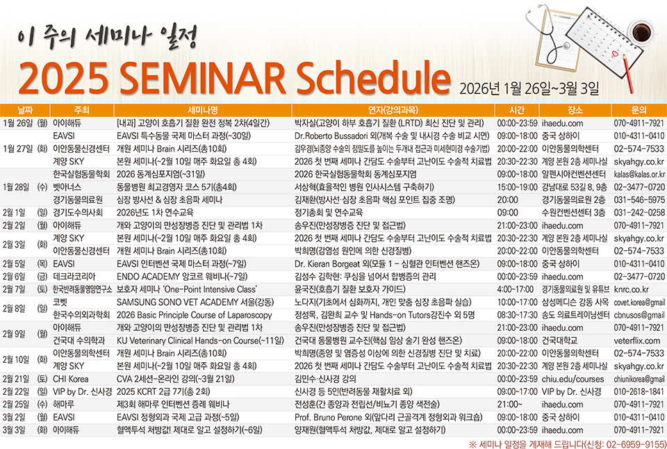이슈포토 [사설] 병오년(丙午年) 새해가 밝았다 계양SKY ‘간담도 수술과 고난이도 수술적 치료법’ 1월 20일(화)부터 매주 화 로얄캐닌-FASAVA, 아·태 전략적 파트너십 체결 [스페셜 임상] 해마루 학술정보⑥ | 고양이 림프종의 해부학적 형태별 접근과 치료 전략 국제 수의사 아카데미 ‘EAVSI 코스’ 카데바 실습까지 “상하이서 해법 찾는다” [세미나 캘린더] 2026년 1월 12일~3월 2일