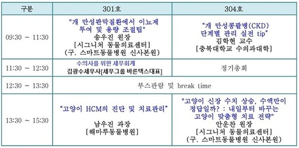 304호에서는 오전에 김학현(충북대 수의대) 교수가 ‘개 만성콩팥병(CKD) 단계별 관리 실전 팁’ 강의를 진행하고, 오후에는 안운찬(시그니처동물의료센터) 원장이 ‘고양이 신장 수치 상승, 수액만이 정답일까?: 내일부터 바꾸는 고양이 맞춤형 치료 전략’을 제시할 계획이다.