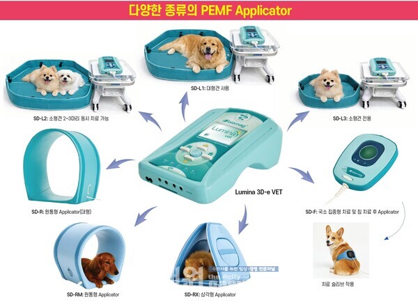 ‘Lumina 3D-e VET’ 시스템은 다양한 동물 체형과 치료 목적에 맞춰 여러 형태의 애플리케이터를 선택적으로 구성할 수 있도록 설계됐다. 대형견과 소형견을 위한 베드형 애플리케이터를 비롯해 국소 부위 집중 치료용, 원통형·삼각형 구조의 애플리케이터 등 다양한 옵션이 제공된다.