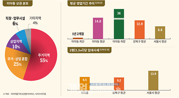 다시 말해 미아동은 화려한 상업 집적지라기보다는 안정적인 임대 구조와 생활형 상권을 기반으로 한 실수요 중심 지역에 가깝다. 초기 투자 부담을 관리하면서 장기 운영을 고려하는 업종에게는 건물 개별 특성을 면밀히 검토할 경우 충분한 사업성을 기대할 수 있는 임대 시장으로 볼 수 있다.