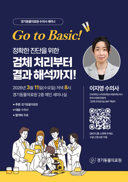 경기동물의료원이 임상수의사들의 진단 역량 강화를 위한 학술 세미나를 오는 3월 11일(수) 오후 8시 경기동물의료원 2층 메인 세미나실에서 개최한다.