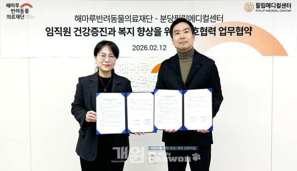 해마루반려동물의료재단(이사장 김소현)과 창덕의료재단 필립메디컬센터(이사장 김태진)가 지난 2월 12일 사람과 반려동물의 건강을 함께 돌보는 협력 체계를 구축하기 위한 상호협력 협약을 체결했다.