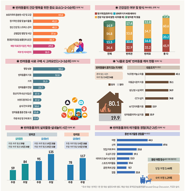 반려견 가구의 59.3%는 주 4일 이상 반려견과 산책, 달리기, 훈련 등 다양한 실외 활동을 했으며, 하루 중 반려동물을 집에 두고 외출한다고 답한 가구는 80.1%로 하루 평균 5시간 54분을 홀로 있었던 것으로 조사됐다. 무엇보다 정기적으로 건강검진을 받는 가구가 1/3 수준으로 높아져 ‘예방의료’에도 관심이 많은 것으로 나타났다.