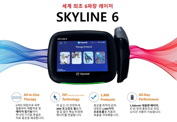 ‘SKYLINE 6’는 450nm·532nm·650nm·810nm·915nm·980nm 등 6가지 파장을 모두 구현하는 동물용 레이저 장비로 피부질환부터 재활 치료, 레이저 침 기능까지 폭넓게 활용할 수 있는 올인원 솔루션이다.