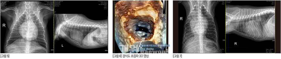 여기까지만 봤을 때는 피모벤단만 처방이 나가는 것, 리즈너블 하다고 생각할 수 있다. 그런데 같은 환자의 경식도 초음파 영상을 보자.