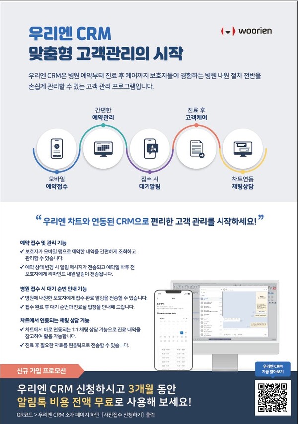 우리엔(대표 고석빈)이 동물병원 전용 고객관리 솔루션 ‘우리엔 CRM’의 신규 가입자를 대상으로 3개월간 알림톡 비용 전액 무료 혜택을 제공하는 특별 프로모션을 진행한다.