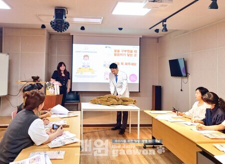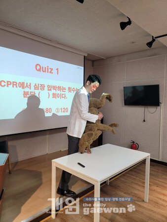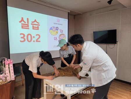 이어 본격적인 CPR 교육에서는 마네킹을 활용한 시연과 일대일 실습이 이어졌다. 강아지는 심장 위치가 사람과 달라 정확한 흉부 압박이 필요하고, 입이 아닌 코를 통한 인공호흡이 요구된다는 점에서 실습을 통한 반복 훈련의 중요성이 강조됐다.