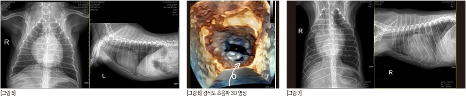 여기까지만 봤을 때는 피모벤단만 처방이 나가는 것, 리즈너블 하다고 생각할 수 있다. 그런데 같은 환자의 경식도 초음파 영상을 보자.
