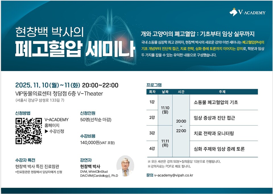 글로벌 수의학 교육기관 V-ACADEMY가 오는 11월 10일(월)~11일(화) 양일간 오후 8시부터 10시까지 ‘현창백 박사의 폐고혈압 세미나’를 VIP동물의료센터 청담점 6층 V-Theater에서 개최한다.