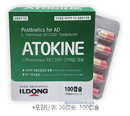 (주)솔벳(대표 김규욱)이 공급하는 ‘아토카인’은 개와 고양이의 장내 및 피부 면역 기능 개선 효과로 한 캡슐에 25억 셀이 담긴 특허받은 국내 최초의 기능성 포스트바이오틱스 ‘ID-RHT 3201’(Lactobacillus rhamnosus IDCC3201 열처리배양건조물)을 함유했다.