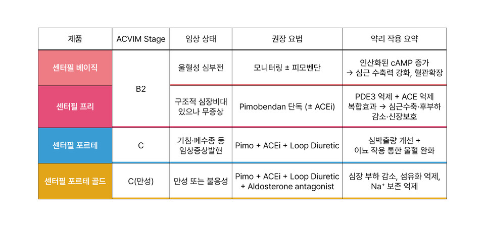 ‘개의 심장, 그 모든 단계에 완벽하게 맞춘 치료 솔루션’이라는 슬로건 아래 심장질환의 병태생리 진행 단계(수축력 저하 → 후부하 증가 → 체액 정체 → 구조적 리모델링)에 따라 4가지 제품을 단계별로 병용·확대할 수 있도록 설계했다.