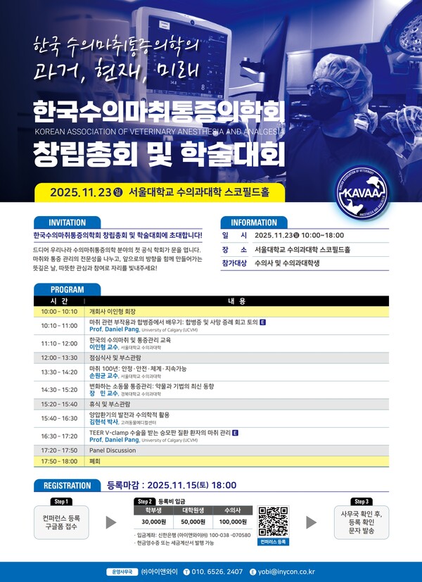 한국수의마취통증의학회(KAVAA)가 오는 11월 23일(일) 서울대학교 수의과대학 스코필드홀에서 창립 총회를 열고, 공식 출범한다.