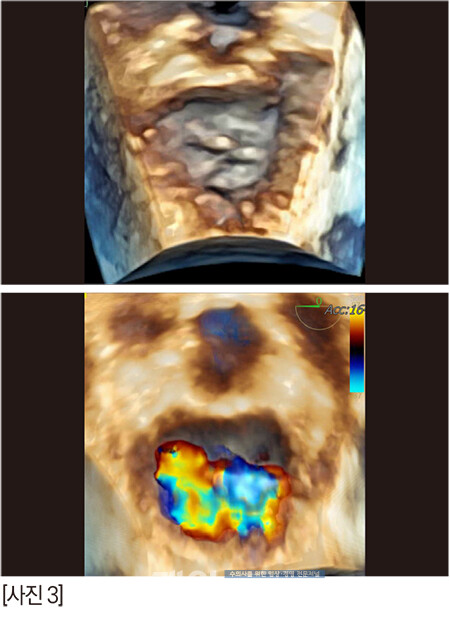 anterior의 zone 2-3과 posterior의 zone 2가 좀 뒤집어지고 있다. 이것은 건삭의 일부가 끊어져 너덜거리는 것으로 예측한다. 2D에서는 역류가 심해 보이지 않았지만 3D에서는 꽤 심해 보인다.