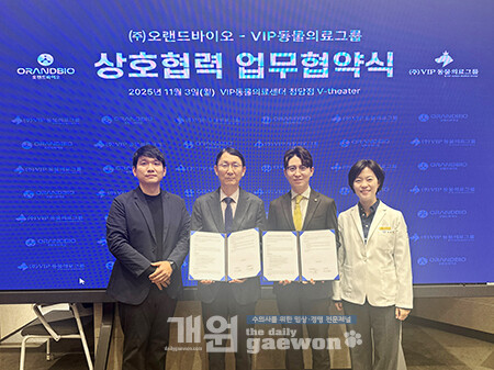 VIP동물의료그룹(대표 최이돈)과 생분해성 고분자 기반 의료기기 개발 전문기업 ㈜오랜드바이오(대표 한동근)가 지난 11월 3일 ‘반려동물 신장 기능회복 지지체 플랫폼 개발 및 적용’을 위한 업무협약을 체결했다.