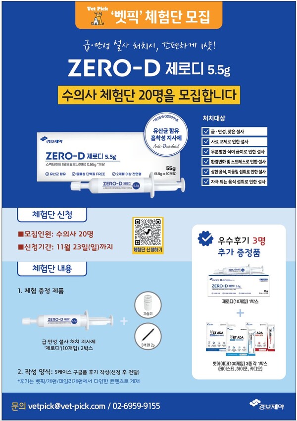 동물병원 전용 폐쇄몰 ‘벳픽(vet-pick.com)’에서 경보제약의 급·만성 설사 처치 지사제 ‘제로디(ZERO-D) 5.5g’ 수의사 체험단 20명을 모집한다.