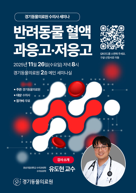 경기동물의료원(대표원장 윤국진·김범수·김태정·이승혁)이 11월 26일(수) 오후 8시, 경기동물의료원 본원 2층 메인 세미나실에서 임상 수의사를 대상으로 ‘반려동물 혈액 과응고·저응고 최신 업데이트’ 무료 세미나를 개최한다.