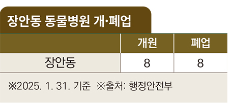 행정안전부 최신 데이터에 따르면, 동대문구 장안동은 1991년부터 동물병원이 개원하기 시작해 2025년 1월 31일 기준 총 16개소가 개원, 이 중 8개소(50%)가 문을 닫고, 현재 8개소(50%)가 개원을 유지하고 있다.