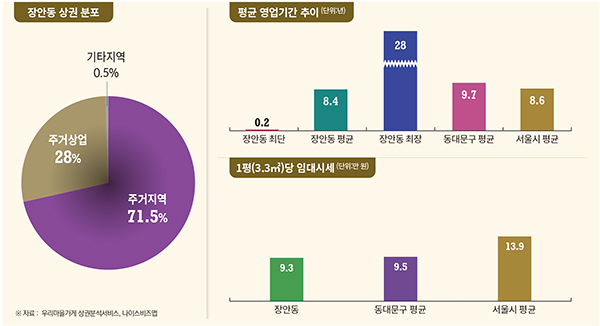 장안동은 전형적인 주거 중심 생활권으로 특히 장안2동은 주거지역 비중이 100%에 달하는 순수 주거형 상권이다.