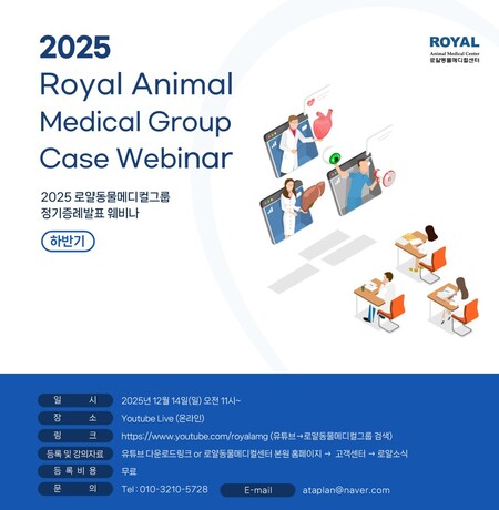 로얄동물메디컬그룹이 ‘2025년 하반기 정기증례발표 웨비나’를 오는 12월 14일(일) 오전 11시부터 로얄동물메디컬그룹 유튜브(youtube.com/@royalamc)를 통해 온라인으로 진행한다.
