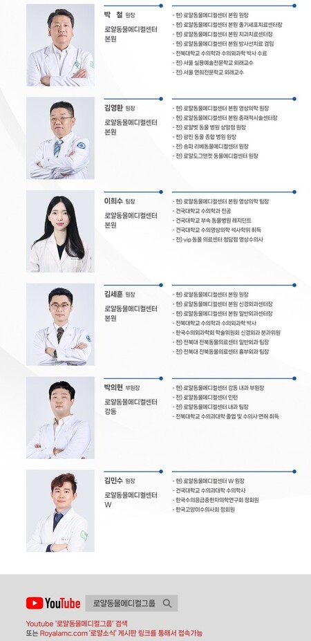 이번 정기증례발표회는 ‘로얄동물메디컬그룹’을 유튜브에서 검색해 접속하면 무료로 시청할 수 있다. 등록 및 자료 다운로드는 유튜브 안내 링크 또는 로얄동물메디컬센터 본원 홈페이지(royalamc.com → 로얄소식)에서 가능하다.
