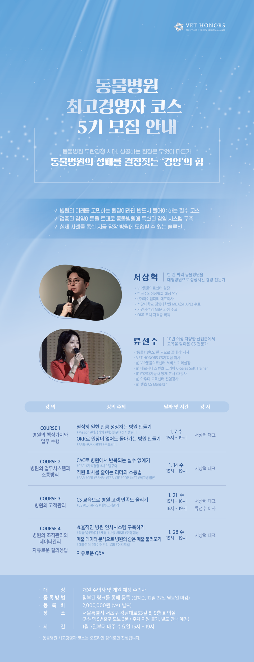 강의는 한 칸짜리 동물병원을 대형 병원으로 성장시킨 경영 전문가 서상혁 대표(VIP동물의료센터 원장)와 10년 이상 다양한 산업군에서 교육을 맡아온 CS 전문가 류선수 이사가 맡는다.