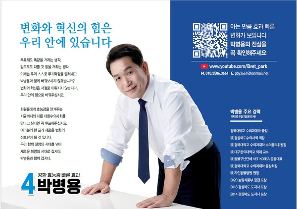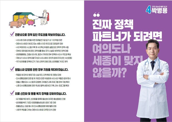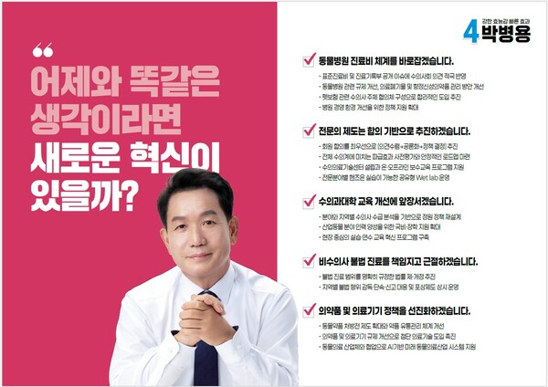대국민 홍보로 시민들로부터 존중받도록 하겠다. 반드시 하고, 제대로 하고, 될 때까지 하는 회장이 되겠다. 말이 아닌 행동으로 회원들이 체감할 수 있는 변화를 만들 것이다. ‘동물보다 수의사가 먼저’라는 원칙을 행동으로 증명할 준비가 돼 있다. 그 역할을 박병용이 하겠다.
