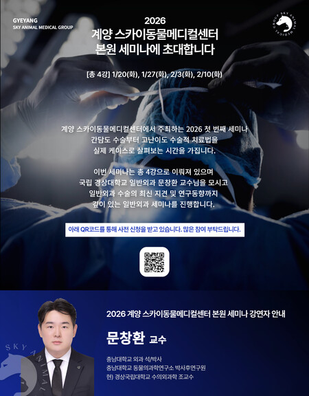 계양 스카이동물메디컬센터가 주최하는 새해 첫 번째 ‘2026년 계양 스카이동물메디컬센터 본원 세미나’가 ‘간담도 수술부터 고난이도 수술적 치료법’을 주제로 1월 20일부터 2월 10일까지 매주 화요일 총 4강으로 진행한다.