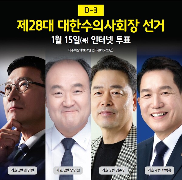 제28대 대한수의사회 회장 선거는 오는 1월 15일(목) 3일 앞으로 다가왔다. 100% 인터넷 투표를 통해 선출되는 차기 회장은 향후 수의사 직역의 권익 보호와 제도 개선, 사회적 역할 확대를 이끌 수의계 전체 책임을 맡게 된다.
