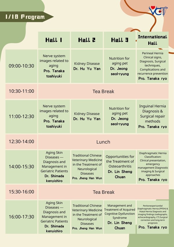 대만을 비롯한 해외에서 16명의 전문가와 교수, 박사가 연자로 참여해 심도 있는 내용을 다룰 예정이다. 강의는 △흉·복강 연부조직 종양 외과 △골·관절 및 인대 손상에 대한 정형외과 수술 △뇌·신경 CT 및 MRI 영상 판독 △노령 심장질환의 내과적 최신 치료 △안과 질환의 최적 치료 전략 △신경학, 피부과, 노령성 신장질환 △종양학, 중수의학, 영양학 및 노령 동물 케어를 연제로 최근 임상수의사들에게 가장 필요한 주요 임상 분야의 최신 지견을 아우르는 고품질 종합 학술 포럼이 될 전망이다.